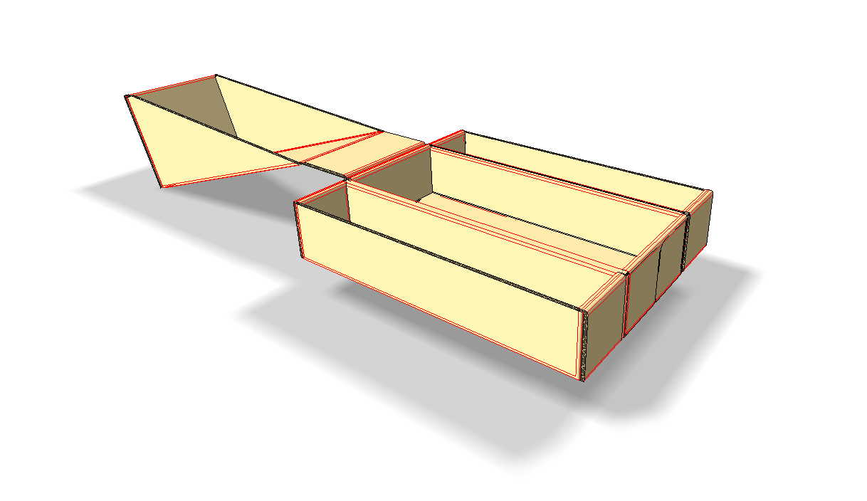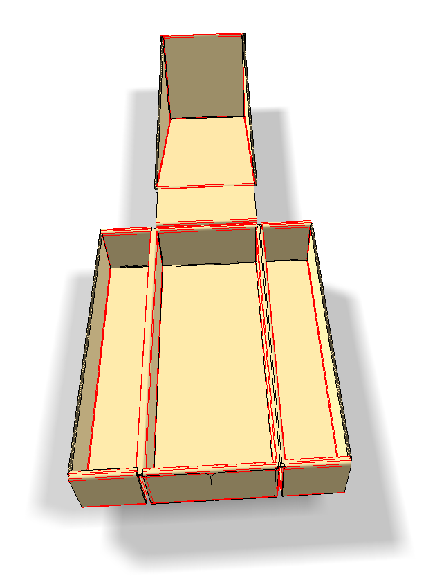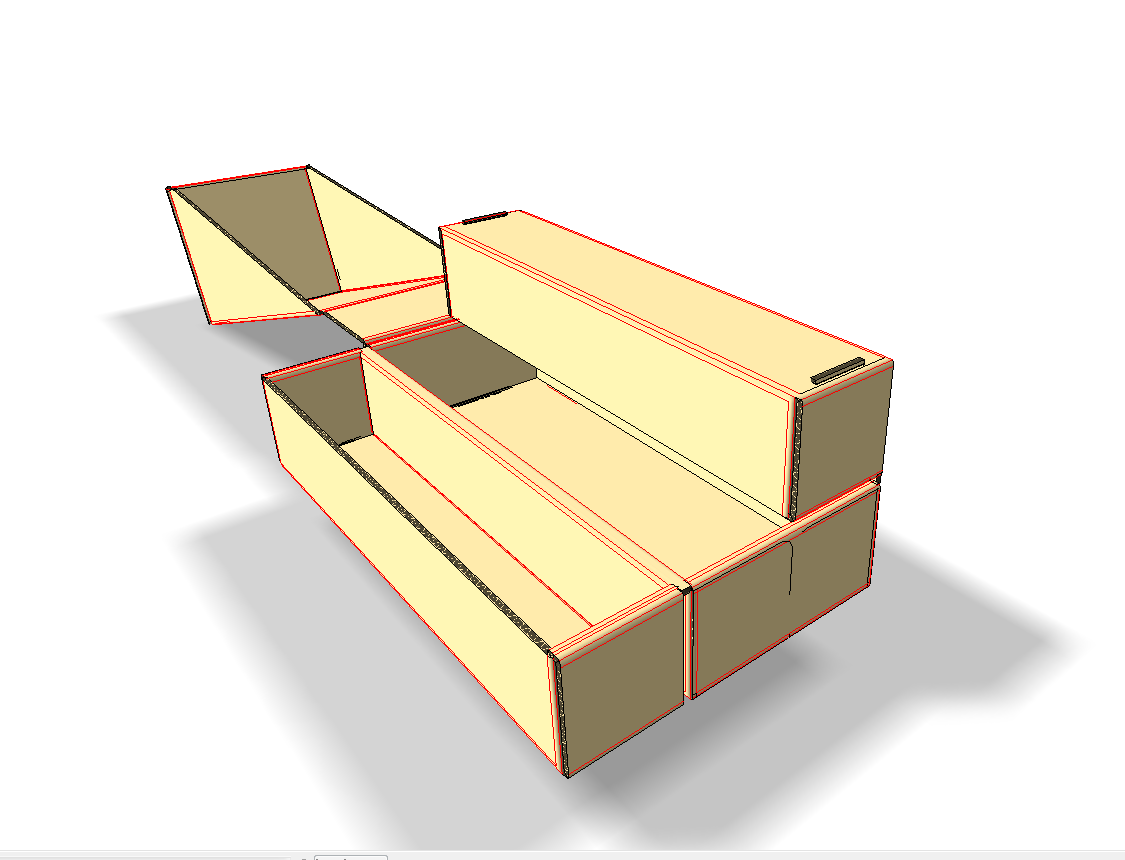 La forma del nostre pack, com ja us haureu adonat compte per les fotografies, ha canviat, ha deixat de ser cúbica per ser més allargada i rectangular(40 x 15 x 15 cm). L’interior es divideix en dos pisos, el superior dividit per dues peces adderides al laterals del pack, i el pis inferior que es composa de una sola estructura. Els motors aniràn en les dues parts mòbils superiors, junt amb peces, tot això dividit per dos compartiments. I a la part inferior es trovarà l’avantbraç aixecat a la part del mig, que ens servirà per separar l’estructura, fent la funció de costella. I a la resta de l’espai hi hauràn més costelles fetes amb microcanal per tal de distribuïr les peces de diferents mides.